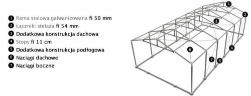Konstrukcja namiotu wykonana została z rur ocynkowanych fi 50 mm oraz łączników z rur fi 54 mm. Całość jest skręcana śrubami. Dodatkowa konstrukcja dachowa oraz podłogowa. Na dole namiotu, znajdują się okrągłe stopy fi 11 cm z otworami, pozwalające przymocować namiot do podłoża.