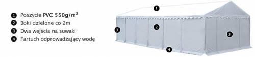 Poszycie namiotu zostało wykonane z PVC 550g/m2. Plandeka podobna do plandek stosowanych na samochodach typu TIR. Odporna na promienie UV oraz wiatr. Poszycie namiotu jest 100% wodoodporne. Powłoka dwustronnie lakierowana oraz odporna na temperatury w zakresie od +60*C do -30*C. Dodatkowo namiot posiada fartuch odprowadzający wodę na zewnątrz, zapobiegając dostaniu się wody do środka.