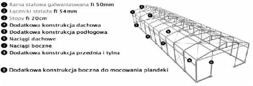 Konstrukcja namiotu zrobiona jest z rur ocynkowanych oraz łączników . Całość jest łączona śrubami. Konstrukcja dachu, podłogi, przednia oraz tylna jest dodatkowo wzmocniona. Na dole namiotu, znajdują się okrągłe stopy z otworami, pozwalające przymocować go do podłoża. Namiot można eksploatować w trudnych warunkach atmosferycznych.