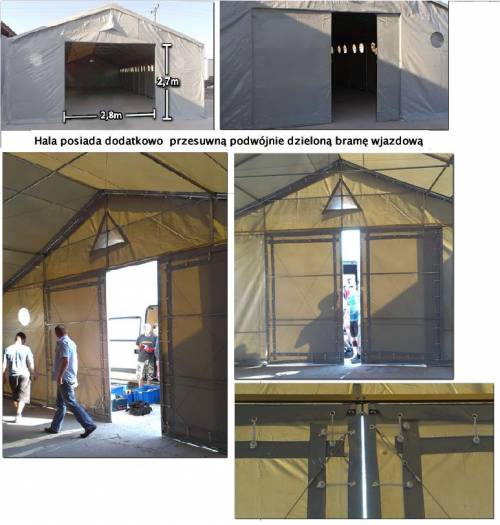 Namiot posiada dwa niezależne wejścia zamykane na paski, umieszczone są na krótszych bokach. Oba mają szerokość 3,8m. Dodatkowo wejścia mocowane są na specjalnych gumkach, które pozwalają w szybki i prosty sposób utworzyć wejście o pełnej szerokości namiotu. Istnieje dodatkowa możliwość zamówienia drzwi stalowych, szklanych lub kurtyny przesuwnej.