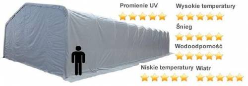 Do wykonania poszycia hali namiotowej wykorzystano zaawansowany technicznie materiał na bazie poliestru z powłoką najwyższej klasy PVC 550 g/m2. Powłoka plandeki jest dwustronnie lakierowana oraz odporna na temperatury w zakresie od 60*C do -30*C . Dodatkowo namiot posiada specjalny fartuch odprowadzający wodę na zewnątrz, który zapobiega dostaniu się wody do środka.
