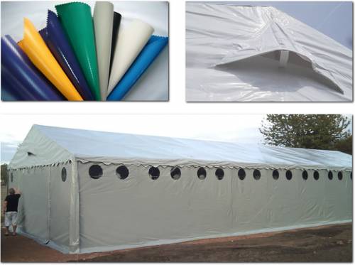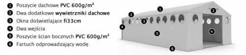 Poszycie namiotu jest wykonane z PVC 600g/m2. Plandeka natomiast wykonana jest na podobieństwo plandek typu TIR i jest odporna na promienie UV oraz wiatr. Poszycie namiotu jest 100% wodoszczelne oraz wytrzymałe na temperatury w zakresie od 60*C do -30*C. Dodatkowo namiot posiada fartuch odprowadzający wodę na zewnątrz.