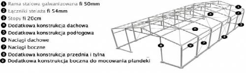 Konstrukcja namiotu wykonana została z rur ocynkowanych oraz łączników . Całość łączona jest śrubami. Konstrukcja dachu, podłogi, przednia oraz tylna jest dodatkowo wzmocniona. Na dole namiotu, znajdują się okrągłe stopy z otworami, które pozwalają przymocować go do podłoża. Namiot można eksploatować w różnych warunkach atmosferycznych.