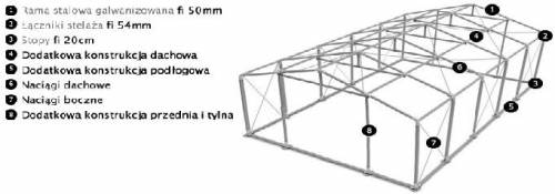 Konstrukcja namiotu jest wykonana z ocynkowanych rur oraz łączników . Całość łączona jest śrubami. Konstrukcja dachu, podłogi, przednia oraz tylna jest dodatkowo wzmocniona. Na dole namiotu, są okrągłe stopy z otworami, które pozwalają przymocować go do podłoża. Namiot można eksploatować w trudnych warunkach atmosferycznych.