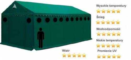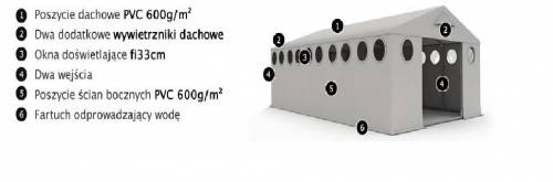 Poszycie namiotu wykonane zostało z PVC 600g/m2. Plandeka wykonana jest na podobieństwo plandek w TIR-ach. Jest odporna zarówno na promienie UV oraz wiatr. Poszycie namiotu jest 100% wodoodporne, oraz wytrzymuje temperatury w zakresie od 60*C do -30*C. Dodatkowo namiot posiada fartuch odprowadzający wodę na zewnątrz.