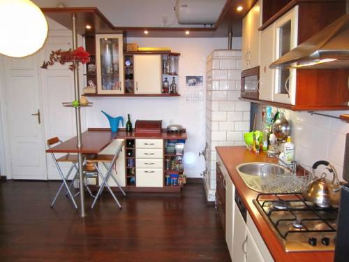 Na podłogach deska sosnowa, w łazience terakota. Zachowane oryginalne drewniane drzwi dwuskrzydłowe, nowe okna PCV. Kuchnia z pełnym wyposażeniem w zabudowie - płyta gazowa, piekarnik elektryczny, lodówka, zmywarka, okap. Kominek w zabudowie z marmuru, z rozprowadzeniem ciepła do wszystkich pomieszczeń, przewody kominowe po generalnym remoncie. Mieszkanie w stanie bardzo dobrym, po remoncie w roku 2009, w tej chwili jedynie do odświeżenia. Kamienica bezczynszowa, ogrodzone i zamykane podwórko, domofon. Doskonały punkt - do stacji PKP 5 minut pieszo, blisko do wszystkich punktów usługowo-handlowych.