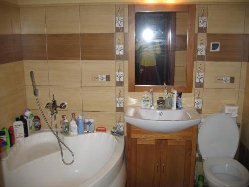 Łazienka: wanna, umywalka z szafką drewnianą + lustro do szafki, muszla wc.
