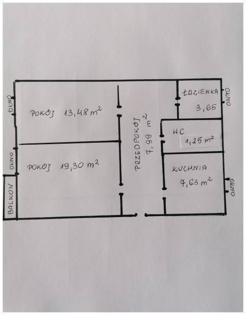 WC ( 1,25 m2) oraz dwóch pokoi ( 19,30 m2 , 13,48 m2 ) . Ekspozycja wschodnio- zachodnia zapewnia optymalne doświetlenie mieszkania w ciągu doby. Piwnica o wymiarach 4,11 m2. W pobliżu markety : Biedronka , Aldi, Twój Market, rynek , szkoła, kościół, apteki, przychodnie lekarskie.