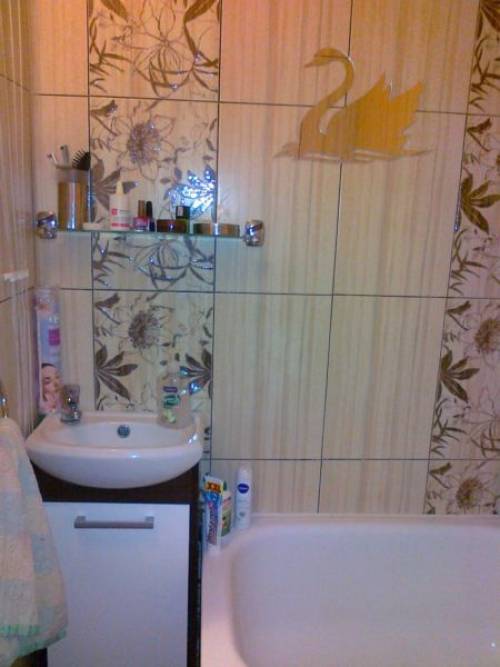 W łazience znajduje się wanna, umywalka z szafką, toaleta, oświetlenie, suszarka na pranie, pralka WHIRLPOOL, lustro- łabędź.