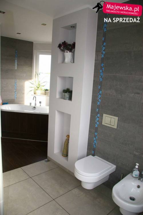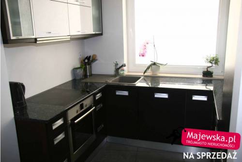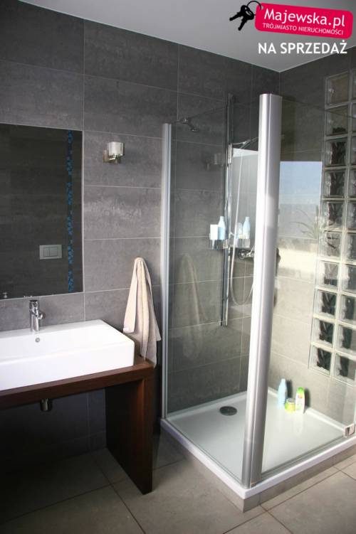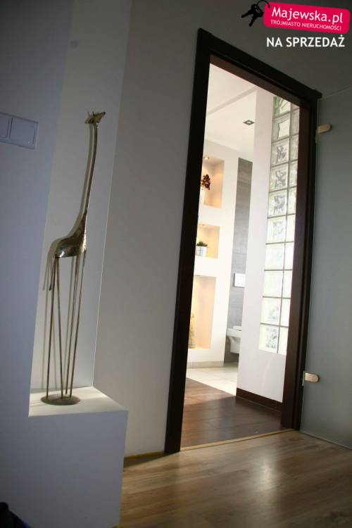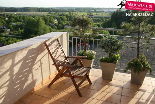 Dwupoziomowy apartament mieści się na drugiej i trzeciej kondygnacji dwupiętrowego budynku z 2007 roku. Górna część połączona jest z tarasem o powierzchni 27,8m2. Do mieszkania należą dwie piwnice, miejsce parkingowe w garażu podziemnym oraz miejsce postojowe na posesji. Pierwszy poziom łączy się z balkonem, którego powierzchnia wynosi 14,2m2. Znajduje się tu salon z jadalnią, kuchnia, korytarz i schody na wyższy poziom. Na podłodze gres szkliwiony, wielkogabarytowy, prostokątny. Kuchnia jest całkowicie wyposażona w meble wenge na dole, matowe szkło i aluminium z białymi panelami na górze, blat w kształcie podkowy, sprzęt znanych marek (zmywarka, piekarnik, płyta grzewcza, zlewozmywak, okap, lodówka energooszczędna) a także szuflady z domykaczami oraz szafki z opóźniaczami i domykaczami. Garderoba do aranżacji, można ja przekształcić w toaletę w zaledwie 5 dni. Właściciel posiada gotowe projekty.