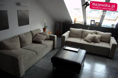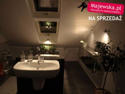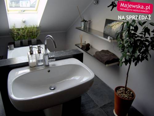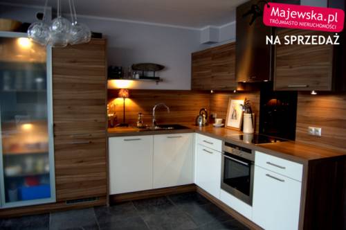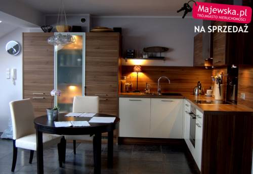 Na drugim poziomie mieści się salon z aneksem kuchennym (30m2). Salon gustownie urządzony, posiada oświetlenie dotykowe. Aneks zrobiony został na zamówienie, fronty mają kolor brązowy (orzech), wyposażony został w wyciąg kuchenny, płytę ceramiczną, zmywarkę, lodówkę , witrynę i szafę na kuchenne sprzęty, zainstalowano oświetlenie sensorowe. Mieszkanie posiada trzy pokoje (11, 11,5 oraz 13 m2). W łazience znajdują się wanna i kabina prysznicowa z kamiennym brodzikiem. Zainstalowano tu zarówno oświetlacze, jak i doświetlacze, co dodaje wnętrzu uroku.