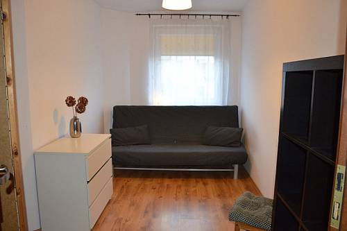 W całym mieszkaniu okna PCV z roletami, na podłodze panele bądź gres.