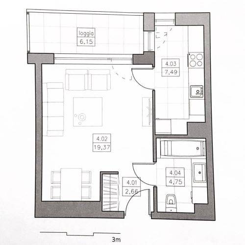 Kawalerka posiada oddzielną, zamykaną kuchnię co jest niewątpliwym plusem mieszkania, duży salon o pow ok 20 m z wyjściem na loggię (balkon nie wystający poza bryłę budynku), łazienkę o pow 4,75 m oraz przedpokój o pow 2,66 m.