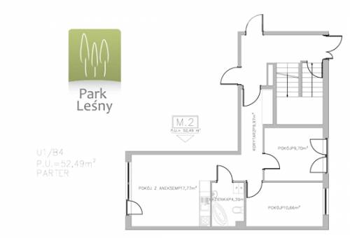 Mieszkanie o powierzchni 52.49 m2, na które składają się 3 pokoje: salon z aneksem kuchennym o powierzchni 17.77 m2, pokój 10,66 m2 oraz pokój 9,70 m2, a także łazienka z wc 4,39 m2.
