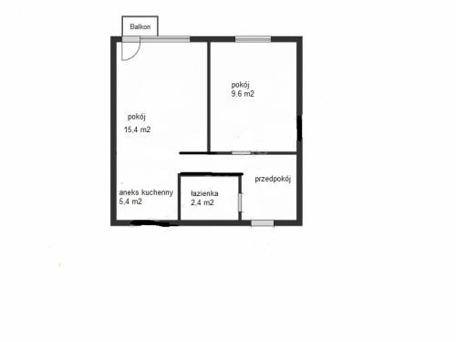 Mieszkanie składa się z dwóch pokoi (15,4 m2, 9,6 m2), kuchni połączonej z większym pokojem (5,4 m2), łazienki (2,4 m2) oraz przedpokoju (5,7 m2). Z większego pokoju wyjście na balkon (1,0 m2).