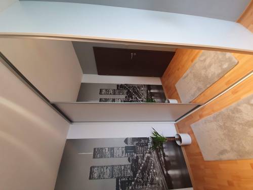 - przedpokoju 5,9 m2 z zabudową Komandor i ścianą z ozdobnego szarego kamienia