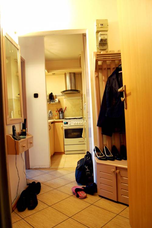 Przedpokój: nowa terakota, duża szafa na ubrania.