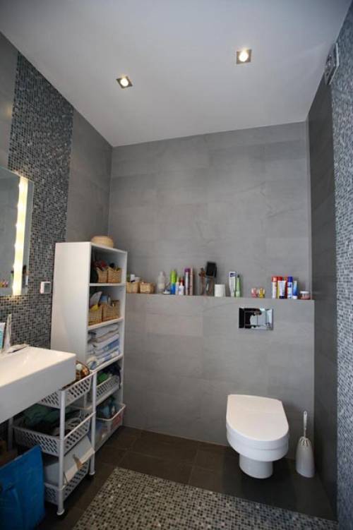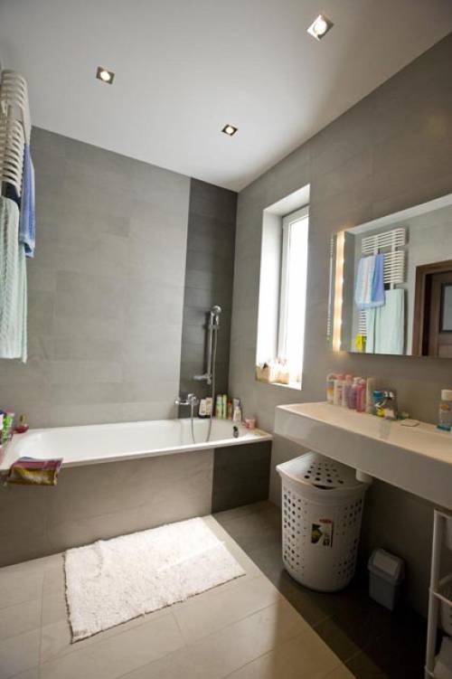 Łazienka: 5,70 mkw, z wanną, okno na pd, włoski gresem i mozaiką, biały montaż: Koło i Roca, sufit podwieszany z halogenowym oświetleniem