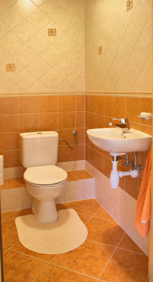 terakota a na ścianach glazura. Na końcu przedpokoju znajduje się osobna toaleta (2,2m2) wykończona tak jak łazienka.
