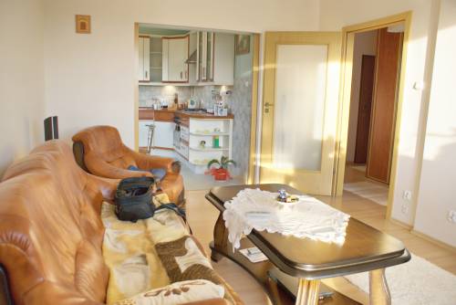 Obok toalety mieści się mała sypialnia (8m2) z oknami wychodzącymi na zachodnią stronę. W sypialni dwuosobowe łóżko, komoda i stolik, na podłodze panele. Następne pomieszczenie mieszczące się obok sypialni to duży salon około 16 m2 wyposażony w kanapę i fotel skórzany , zestaw kina domowego, stolik. Na podłodze panele a okna wychodzą na stronę zachodnią. Z salonu wychodzi się na balkon około 3m2 i do widnej kuchni.