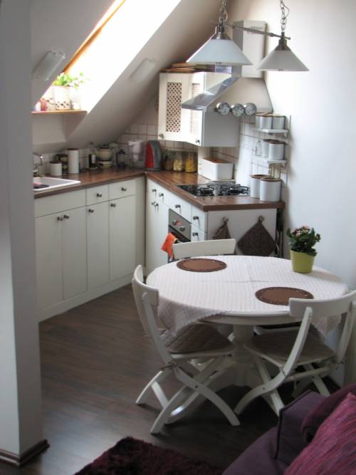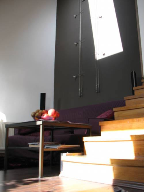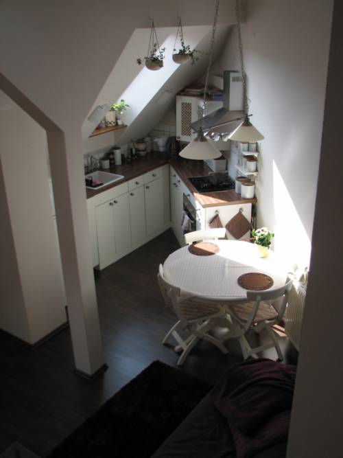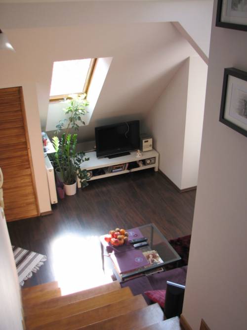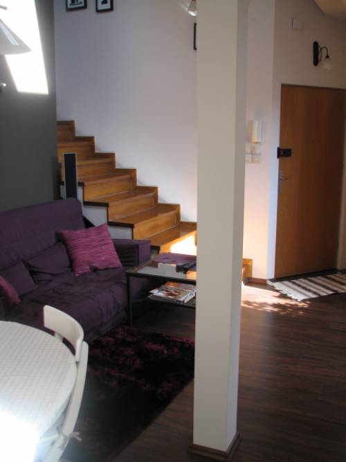 Mieszkanie na 2 piętrze, dwupoziomowe o powierzchni użytkowej 53m2, po podłodze - około 63m2. Na pierwszym poziomie znajduje się salon z aneksem kuchennym (meble kuchenne wbudowane, kuchenka gazowo-elektryczna, okap z odprowadzeniem na zewnątrz, zmywarka) oraz mały pokoik wykorzystywany jako gabinet. Na podłodze panele.