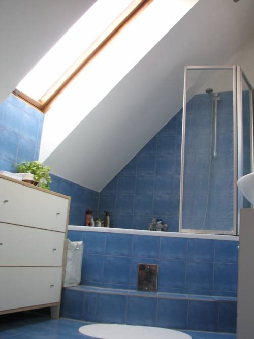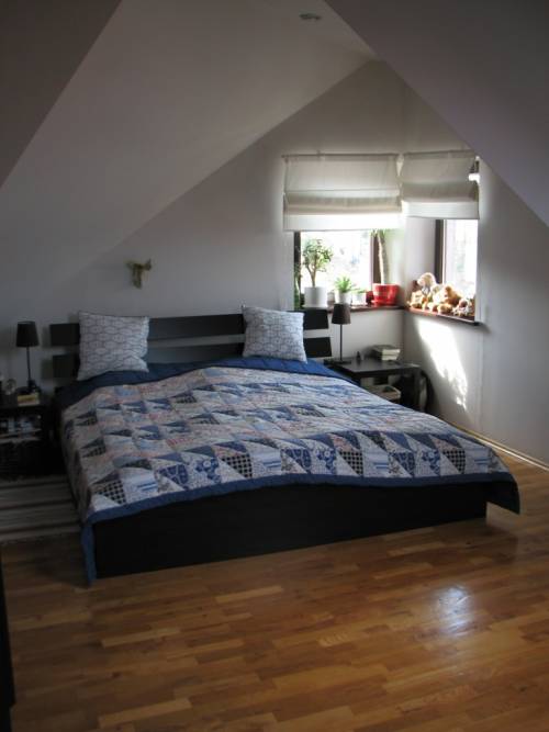 Na drugim poziomie jest przestronna sypialnia (w pełni wyposażona - łóżko 180 x 200, komoda, regał) oraz łazienka (jasna - okno połaciowe). Na podłodze parkiet drewniany, na korytarzu przy sypialni znajdują się dwie przestronne szafy z drzwiami przesuwnymi oraz liczne schowki. W łazience flizy, toaleta, umywalka, wanna z parawanem prysznicowym, mebelki na wymiar. Okna w mieszkaniu są drewniane, na południe i zachód, zacienione roletami.