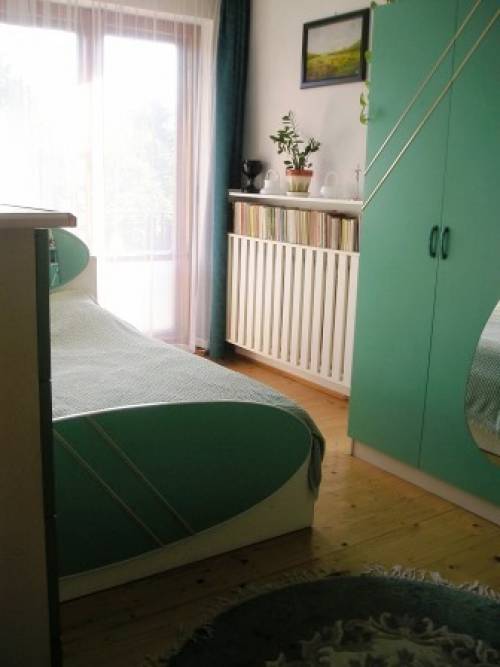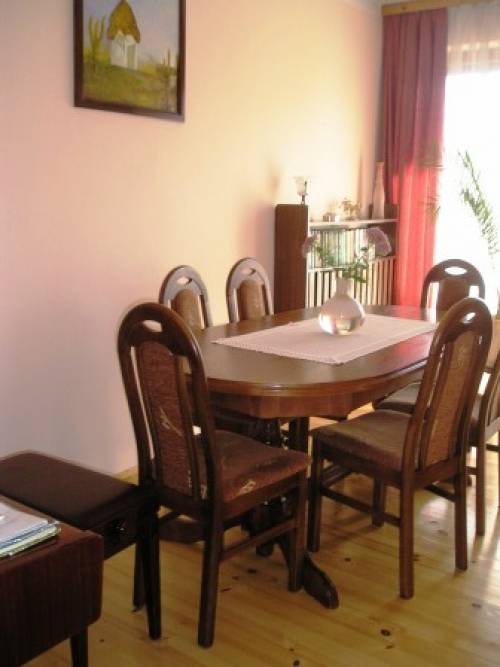 Ładne, zadbane mieszkanie w domu trzy- rodzinnym, na pierwszym piętrze tego domu. Dwustronne, słoneczne, pieciopokojowe mieszkanie- orientacja wg stron świata północ-południe.Bardzo przestronne i przyjemnie wykończone - na podłogach lakierowane deski, okna drewniane, kuchnia duż, jasna z której wychodzimy na olbrzymi 100 m2 taras z widokiem na ogród (orientacja-północ).Łazienka samodzielna z oknem, wc osobno - obydwa pomieszczenia wyflizowane. Mieszkanie nie wymaga remontów, jedynie taras należy wyłożyć płytkami ( w tej chwili beton ).