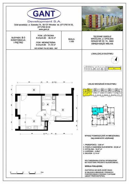 w południowo-wschodniej części Wrocławia, w odległości 6,5 km od wrocławskiego Rynku. Mieszkanie oddane będzie w stanie deweloperskim. Na ścianach tynki, na podłodze wylewki betonowe. Rozprowadzone instalacje (woda, prąd, ogrzewanie). Grzejniki, okna PCV, granitowe parapety, drzwi zewnętrzne antywłamaniowe klasy B. Balkon wykończony gresem.