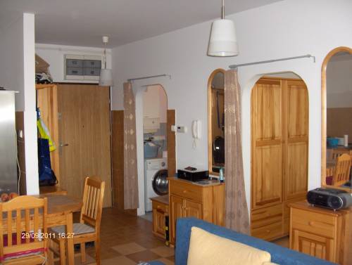 Salon, sypialnia, aneks kuchenny, łazienka (45,27 m2), 1. piętro, duży taras (13,44 m2), garaż w bryle budynku na parterze (23,46 m2), pomieszczenie gospodarcze na parterze (4,06 m2). Mieszkanie kompletnie wyposażone w meble z litej sosny (w salonie i sypialni) i sprzęt AGD+RTV, nadaje się do natychmiastowego zamieszkania. Mieszkanie jest w bardzo dobrym stanie, ściany czyste, bez hałasu, intruzów, kameralnie, spokojnie, cicho.