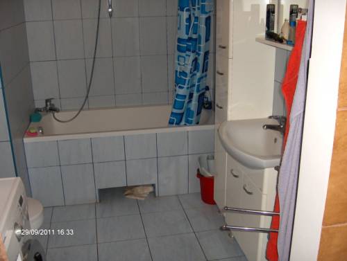 Łazienka: wanna Koło akrylowa zabudowana płytkami +bateria wannowo-natryskowa KFM ?Opal? (oszczędna); umywalka Cersanit + bateria umywalkowa KFM ?Opal?; WC kompakt Cersanit ?Olimpia? z deską antybakteryjną; pralka automatyczna LG ?Direct Drive? wsad 7 kg; szafka wysoka, szafka pod-umywalkowa i lustro z półką Cersanit; wysoki stojak na ręczniki ze stali szlachetnej; stojak na papier toaletowy ze stali szlachetnej, lampa sufitowa i lampa ścienna (IKEA).