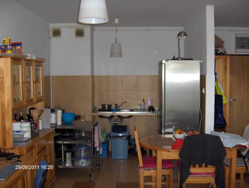 Aneks kuchenny: zlewozmywak dwukomorowy ze stali szlachetnej + bateria zlewozmywakowa KFM ?Opal? wmontowany w blat z płyty laminowanej; kuchnia gazowa z piekarnikiem elektrycznym Ariston ze stali inox na nóżkach stalowych; chłodziarko-zamrażarka Electrolux No Frost; stolik kuchenny roboczy ze stali szlachetnej na kółkach z dwoma półkami.