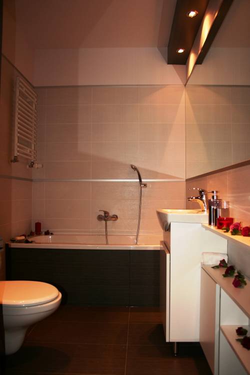 5. Łazienka wyposażona jest w duże lustro, geberit z przestronną szafką na wszystkie w łazience niezbędne rzeczy oraz podwieszany sufit.