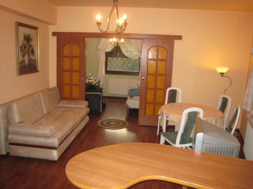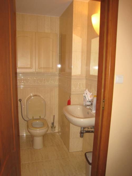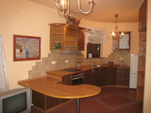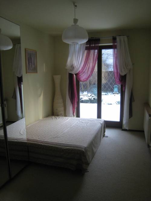 kuchnia z aneksem jadalnym, mały pokój dzienny (biurko, regał + dodatkowe łóżko) oraz sypialnia z łazienką. Osobna toaleta dostępna od strony holu. Kuchnia z płytą elektryczną (nie ma gazu w mieszkaniu) lodówka i zmywarka.