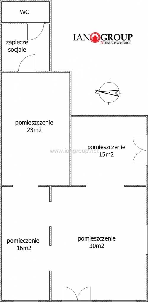 Lokal składa się z 4 połączonych ze sobą pomieszczeń, zaplecza socjalnego i WC – wspólnie z sąsiednim lokalem.