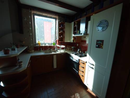 Jasna, komfortowa i widna kuchnia z oknem jest w pełni zabudowana i wyposażona (kuchnia, zmywarka, lodówka, mikrofala), a w jadalni znajduje się narożnik oraz rozkładany stół.