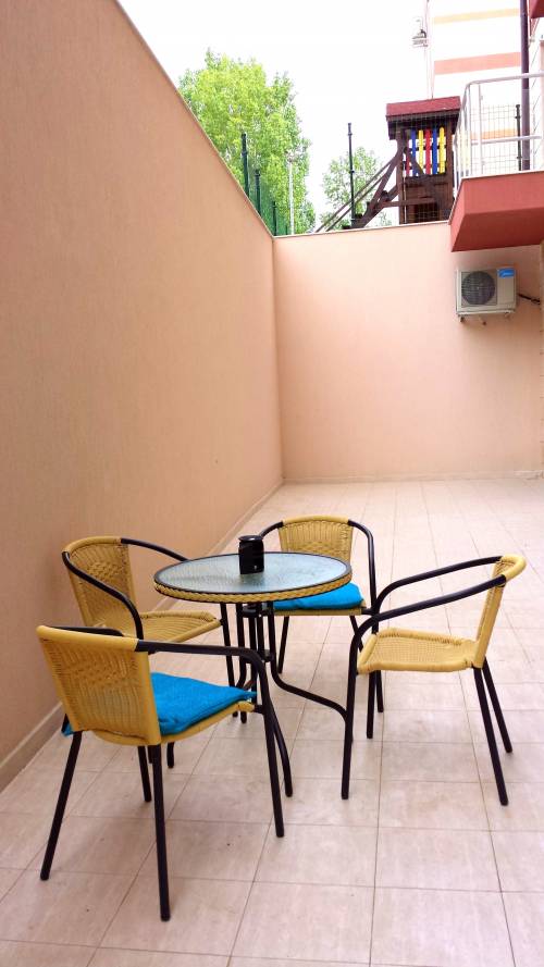 W kazdym apartamencie znajduje się: oddzielony od części sypialnianej aneks kuchenny urządzony w meble kuchenne, zlew, lodówkę, płytę grzewczą, czajnik, mikrofalówkę oraz inne niezbędne przedmioty kuchenne np. (patelnia, garnki, szklanki, talerze, kieliszki do wina, sztućce, korkociąg, deska do krojenia itd). W łazience znajduje się kabina prysznicowa, toaleta, umywalka, lustro, suszarka do włosów. Posiada 4 miejsca noclegowe ( 2 kanapy rozkladane lub lozko + kanapa ), stolik kawowy, stół i 2 krzesła, garderobę. Wyposażony jest również w TV z płaskim ekranem, telewizję satelitarną oraz internet łącze i wifi, klimatyzację i sejf, posiada również żelazko i deskę do prasowania. Na tarasie jest zestaw mebli ogrodowych.