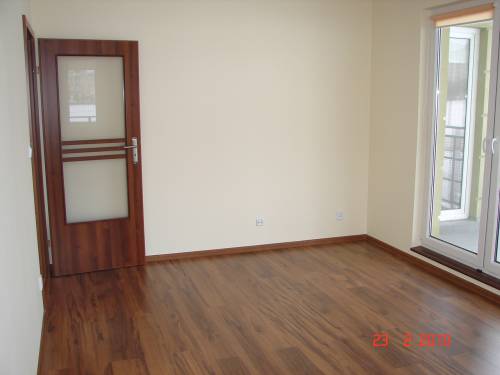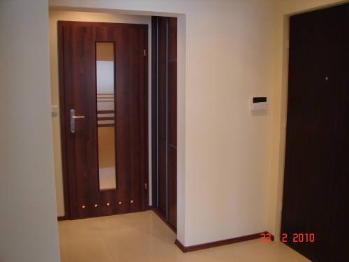 Przedpokój o powierzchni 7,78m2 z zabudowaną szafą wnękową, na podłodze gres. Trzy oddzielne pokoje o powierzchniach odpowiednio: 17,45m2, 12,24m2 i 10,97m2, na podłogach panele w kolorze dąb południowy.