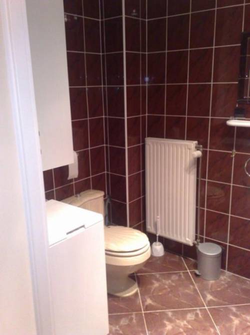 W łazience jest wanna z prysznicem, umywalka, duże lustro, pralka (ładowana od góry) , duża szafka, półki i oczywiście muszla klozetowa.