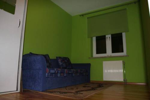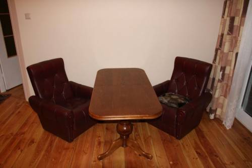 W dużym pokoju znajdują się 2 fotele, ława, sofa (rozkładana), szafka RTV oraz telewizor Panasonic 21 cali podłączony pod sieć kablową.