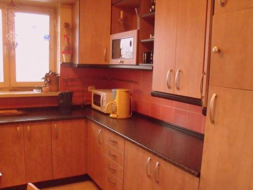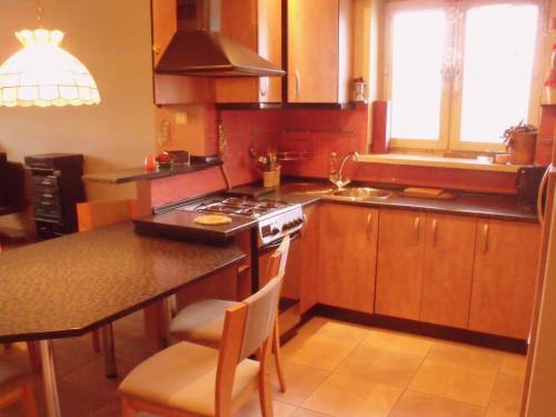 Kuchnia umeblowana oraz wyposażona: lodówko-zamrażarka, piekarnik, kuchenka, pochłaniacz, zmywarka, ponadto stół jadalniany z krzesłami.