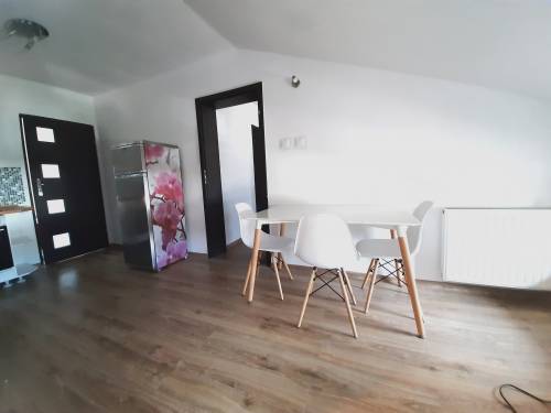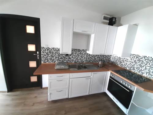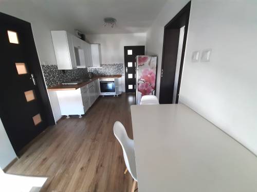 - kuchnia z szafkami, stołem i z niezbędnymi sprzętami AGD – lodówka, kuchnia elektryczna z piekarnikiem, czajnik.